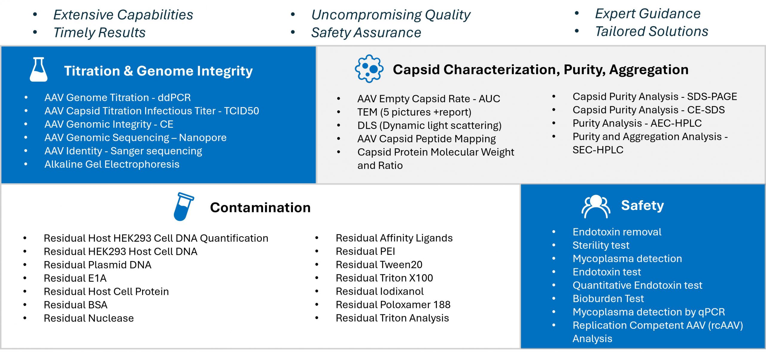 Understanding the quality and integrity of Adeno-Associated Virus (AAV) samples is essential for the success of gene therapy applications. Comprehensive AAV testing is critical to ensuring the efficacy, safety, and consistency of AAV vectors. PackGene offers over 40 AAV analytical tests that cover various aspects, including titration, genome integrity, capsid characterization, purity and aggregation, contamination, and safety to help you from early research and development to GMP production.