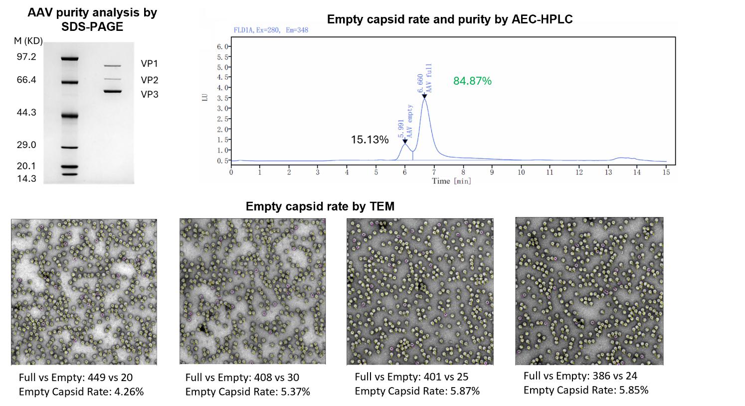 | Empty Capsid | TEM, guaranteed empty capsid rate <30% for common serotypes | TEM, guaranteed empty capsid rate <20% for common serotypes | - |